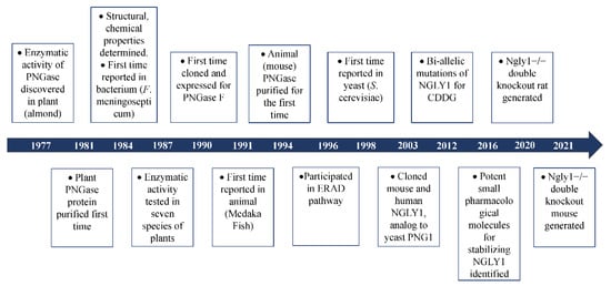 The cytosolic PNGase (peptide:N-glycanase), also known as peptide-N4-(N-acetyl-β-glucosaminyl)-asparagine amidase, is a well-conserved deglycosylation enzyme (EC 3.5.1.52) which catalyzes the non-lysosomal hydrolysis of an N(4)-(acetyl-β-d-glucosaminyl) asparagine residue (Asn, N) into a N-acetyl-β-d-glucosaminyl-amine and a peptide containing an aspartate residue (Asp, D). This enzyme (NGLY1) plays an essential role in the clearance of misfolded or unassembled glycoproteins through a process named ER-associated degradation (ERAD). Accumulating evidence also points out that NGLY1 deficiency can cause an autosomal recessive (AR) human genetic disorder associated with abnormal development and congenital disorder of deglycosylation. In addition, the loss of NGLY1 can affect multiple cellular pathways, including but not limited to NFE2L1 pathway, Creb1/Atf1-AQP pathway, BMP pathway, AMPK pathway, and SLC12A2 ion transporter, which might be the underlying reasons for a constellation of clinical phenotypes of NGLY1 deficiency. The current comprehensive review uncovers the NGLY1’ssdetailed structure and its important roles for participation in ERAD, involvement in CDDG and potential treatment for NGLY1 deficiency.