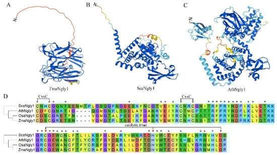 Predicted structures for non-animal Ngly1 and the core transglutaminase-like domain. (A) AlphaFold predicted structure of FmeNgly1; (B) AlphaFold predicted structure of SceNgly1; (C) AlphaFold predicted structure of AthNgly1; (D) Sequence alignment of the core transglutaminase-like domain. Fme, Flavobacterium meningosepticum; Sce, Saccharomyces cerevisiae; Ath, Arabidopsis thaliana; Osa, Oryza sativa Japonica; Zma, Zea mays; * represents conserved residuals; red * represents the three residuals of the catalytic triad.