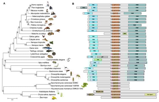 Evolutionary relationships of NGLY1 in 33 taxa. (A) Evolutionary phylogeny; (B) Protein structures of Ngly1.