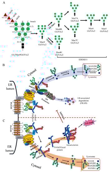 Glc3Man9GlcNAc2 trimming process and ER-associated degradation pathway (ERAD) involving NGLY1. (A) Glc3Man9GlcNAc2 trimming process; (B) ERAD under normal physiological state; (C) ERAD with NGLY1 deficiency.
