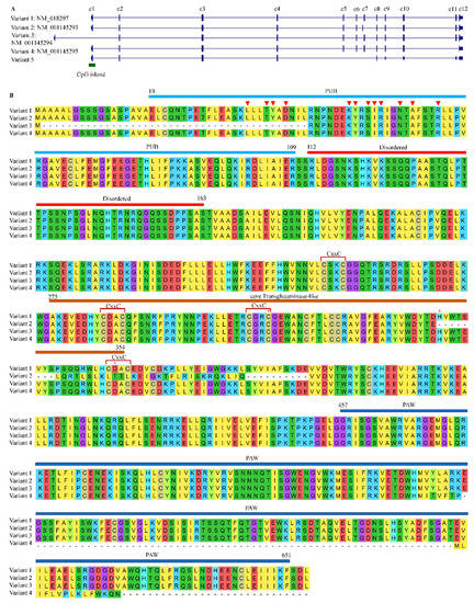 After searching reference genomes, no paralogs of NGLY1 were found in animals including humans, therefore, NGLY1 should be a single-copy gene, just as in yeast and plants [8]. Currently, it is widely taken for granted that alternative splicing of eukaryotic transcripts is a common mechanism to generate vast protein diversity from a limited number of genes [96]. Therefore, one may ask whether there exist other NGLY1 isoforms produced through alternative splicing to perform different functions. For humans, five kinds of alternative splicing were identified (Figure 6A). Taking variant 1 (NM_018297) as reference, variant 2 (NM_001145293) used a new exon 7′ instead of the canonical one. The correspondent protein (NP_001138765) lacked the C-terminal part of the TGase core domain without two residues of the Cys-His-Asp catalytic triad (Figure 6B). The variant 3 (NM_001145294) started its transcription at a bi-directional promoter (chr3:25,831,337–25,831,648, shared with OXSM) 6.57 kb upstream of variant 1. The encoded protein lacked part of the PUB domain (19–43) (Figure 6B). Since this portion of PUB contained 4 of the 12 amino acids responsible for binding with VCP (p97), the ER-membrane-bound ability might be significantly impaired. As for the variant 4 (NM_001145295), the exon 11 was skipped to result in a short transcript with 142 bp less. This generated a premature stop codon which in turn shortened the peptide sequence at its C-terminus PAW domain without affecting the PUB and core Transglutaminase-like domain. Since PAW domain was required for the binding of NGLY1 to the high-mannose N-linked oligosaccharides [60], the resultant protein should possess the whole enzymatic activity. However, it was reported that the protein from variant 4 did not seem to be involved in the generation of free oligosaccharides, and therefore in the ERAD process [97]. After browsing the transcripts from NGLY1, a novel variant (variant 5) was identified without three exons (from 5 to 7) which introduced a premature stop codon. This variant might be the target of non-sense mediated mRNA decay (NMD) [98]. More in vitro and in vivo experiments should be carried out to study the functions of these alternatively-spliced transcripts for EARD or non-ERAD pathways.