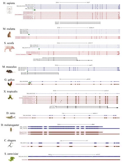 In order to have a comprehensive understanding of the alternative splicing portrayed for NGLY1 in different species, several model organisms were chosen, since annotations of genomes, genes and their expressions have been relatively well studied. Sequences alignment was performed for the refseqs (reference genes), transcript in Ensembl and mRNAs (or expressed sequence tags) in GenBank from human (Homo sapiens), Rhesus monkey (Macaca mulatta), Pig (Sus scrofa), mouse (Mus musculus), Chicken (Gallus gallus), tropical clawed frog (Xenopus tropicalis), Zebrafish (Danio rerio), fruit fly (Drosophila melanogaster), nematode (Caenorhabditis elegans), and fungus (Saccharomyces cerevisiae) (Figure 7). Interestingly, it was found that, the higher the organism in the phylogeny tree, the more splicing patterns were identified. In yeast, SecNgly1 is a single exon gene and no alternative splicing mRNAs have been reported before now. In nematode, fruit fly and zebrafish, no alternative splicing events involving exons were identified, but only with some alternative polyadenylations. For zebrafish, tropical clawed frog and chicken, Ngly1s span about 15 kb in the genomic regions and only have multiple alternative splicing events involving coding regions. In mouse, two incomplete mRNAs were found to lack the third exon, encoding part of the PUB domain (83–161 aa) and one refseq without the ninth exon. It is worth noting that, in pig, Rhesus monkey and humans, one type of alternative splicing lacking the penultimate exon was identified, which might affect the completeness of the PAW domain. However, its significance and function have not been yet established.