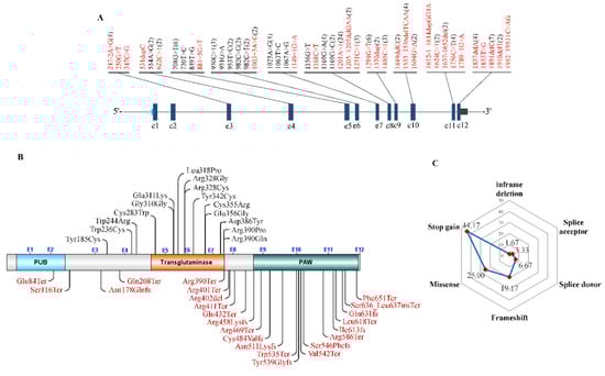 Characterization of mutations of NGLY1. (A) mRNA locations; (B) Amino acid locations; (C) Different types of mutations.
