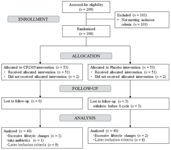 After the intervention, 19 participants were excluded—15 had an abnormal menstrual cycle before registration depending on their diary, 3 had excessive changes in exercise or dietary habits, and 1 consumed antibiotics. Finally, the analysis was conducted with 80 participants—40 each in the CP2305 and placebo groups.