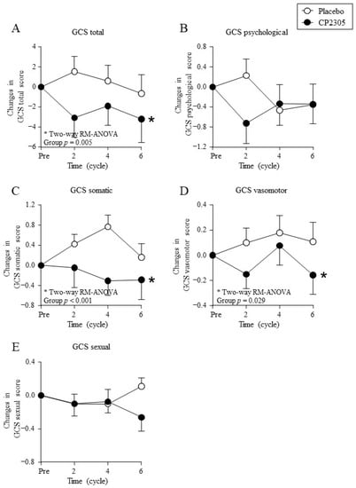Changes in the Greene climacteric scale (GCS) during treatment. Points represent (A) changes in GCS total score, (B) changes in GCS psychological score, (C) changes in GCS somatic score, (D) changes in GCS vasomotor score, and (E) changes in GCS sexual score. * represents statistical difference between groups by two-way repeated measures (RM) ANOVA (detailed statistical results in Supplementary Materials Table S1). The baseline score values, post-intake score values, and percent reduction calculated using these two scores are summarized in Supplementary Materials Table S2.