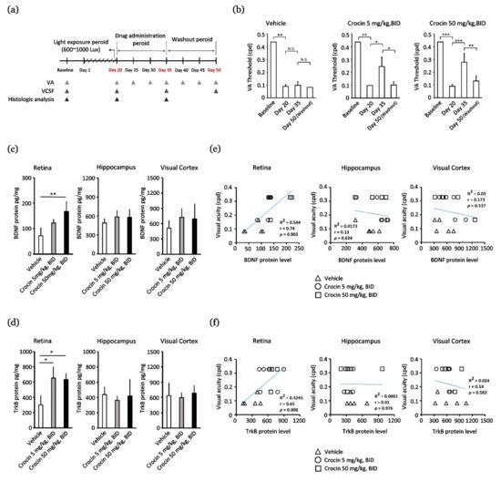 Crocin promotes visual acuity (VA) restoration via upregulating BDNF and TrkB protein content in retinas. (a) Timeline of the experimental design (the arrowheads indicate the occurrence at a given time); (b) recovery of VA by crocin treatment; (c) the BDNF protein content; (d) the TrkB protein content; (e) the correlation coefficient analysis of BDNF protein content and VA threshold; (f) the correlation coefficient analysis of TrkB protein content and VA threshold. Data are expressed as the mean ± standard error (SE). Mann–Whitney U test. *** p < 0.001, ** p < 0.01, and * p < 0.05. BDNF, brain-derived neurotrophic factor; TrkB, tropomyosin receptor kinase B; VCSF, visual contrast sensitivity function; N.S., non-significant; BID, twice a day; cpd, cycles per degree.