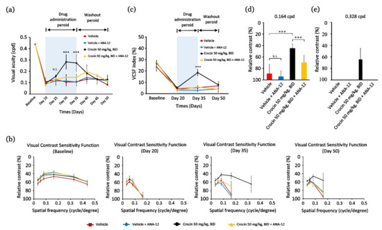 Crocin elevates and restores the thresholds of residual functional vision via activating the BDNF–TrkB pathway. (a) The change in the VA threshold following crocin treatment and washout; (b) the change in the VCSF threshold following crocin treatment and washout; (c) the change in the VCSF visibility index following crocin treatment and washout; (d) individual VCSF thresholds represented in 0.164 cpd; (e) individual VCSF thresholds represented in 0.328 cpd. Data are expressed as the mean ± SE. (a,c) Kruskal–Wallis test. (d) Mann–Whitney U test. *** p < 0.001. ANA-12, TrkB receptor antagonist.