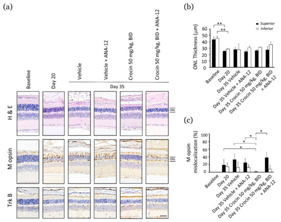 Histopathological microscopic examination indicated a significant decrease in ONL thickness in the retina after 20 days of high-energy light exposure (Figure 3a). There were no obvious changes in ONL thickness in the experimental group on day 35, as compared to the vehicle-treated group or the retina on day 20 (Figure 3b). These results indicate that the restorative effects of crocin-mediated vision might be independent of retinal tissue repair; however, it might functionally elevate the performance of the residual photoreceptors. As a result, photoreceptor function was impaired by mislocation of the M opsin protein in the ONL on day 20 compared to the normal retina (no light exposure) (Figure 3a,c). In particular, on day 35, crocin (50 mg/kg, BID) treatment significantly inhibited M opsin mislocation as compared to the vehicle-treated group or the retina on day 20 (Figure 3a, and p < 0.05, Figure 3c). Notably, synchronous injection of ANA-12 in the crocin-treated group significantly reversed the inhibitory effects of M opsin mislocation (Figure 3a, and p < 0.05, Figure 3c). In contrast, there was no obvious difference between the vehicle-treated and vehicle+ANA-12-treated groups (Figure 3a,c). Additionally, TrkB protein was predominantly increased in the outer segment of the photoreceptor in the crocin-treated group; expression was diminished by synchronous injection of ANA-12 (Figure 3a). These results indicate that crocin may activate the BDNF–TrkB pathway to modulate M opsin protein localization and to function in the outer segment of the photoreceptor, thereby enhancing the residual function of photoreceptors.
