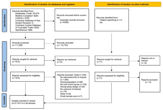 The database search identified 11,205 unique articles; 472 full texts were reviewed, and 31 RCTs were included in this systematic review. Several studies reported results in more than one article, and, thus, forty-eight articles, describing results from the 31 RCTs, were included in this systematic review (Figure 1) [33,34,35,36,37,38,39,40,41,42,43,44,45,46,47,48,49,50,51,52,53,54,55,56,57,58,59,60,61,62,63,64,65,66,67,68,69,70,71,72,73,74,75,76,77,78,79,80].
