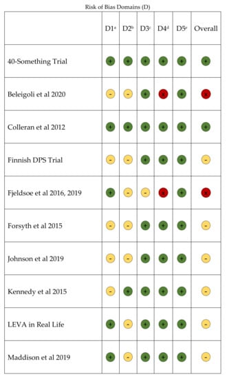 Risk of bias in the systematic review examining effect of nutrition and physical activity interventions provided by nutrition and exercise practitioners for the general population [33,34,35,36,37,38,39,40,41,42,43,44,45,46,47,48,49,50,51,52,53,54,55,56,57,58,59,60,61,62,63,64,65,66,67,68,69,70,71,72,73,74,75,76,77,78,79,80]. a D1: Bias arising from the randomization process; b D2: Bias due to deviations from intended interventions; c D3: Bias due to missing outcome data; d D4: Bias in measurement of the outcome; e D5: Bias in selection of the reported result.