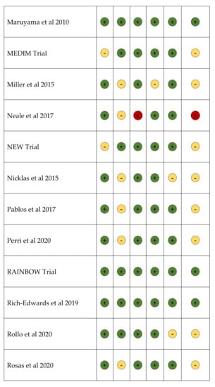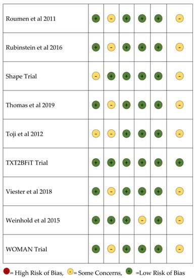 - Sterne, J.A.C.; Savović, J.; Page, M.J.; Elbers, R.G.; Blencowe, N.S.; Boutron, I.; Cates, C.J.; Cheng, H.Y.; Corbett, M.S.; Eldridge, S.M.; et al. RoB 2: A revised tool for assessing risk of bias in randomised trials. BMJ 2019, 366, l4898. [Google Scholar] [CrossRef] [PubMed]