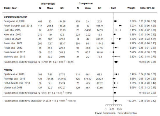 Seventeen RCTs represented in 22 articles examined the effect of nutrition and physical activity interventions provided by nutrition and exercise practitioners on the outcome of physical activity [34,35,41,42,44,45,46,53,56,60,61,63,64,66,67,68,69,71,72,74,77,78]. Thirteen RCTs reported quantitative data that could be pooled in a meta-analysis [35,42,44,46,53,64,66,67,68,69,72,77,78]. In a meta-analysis of 13 RCTs, the intervention resulted in a small but significant effect on physical activity amount [SMD (95% CI): 0.25 (0.08, 0.43) (I2 = 80.4%)] (Figure 3), and findings were significant for both participants with and without cardiometabolic risk factors. Maddison et al. reported heart rate as a measure of physical activity intensity and was not included in the meta-analysis, but the authors did report a significant reduction in resting heart rate in the intervention group compared to the control group [56]. Studies for which authors did not provide data that could be pooled in the meta-analysis reported no difference in physical activity amount between groups [60,61,71]. In adults who were healthy or had cardiometabolic risk factors, nutrition and physical activity interventions provided by nutrition and exercise practitioners may increase physical activity amount (Certainty of Evidence: Low).