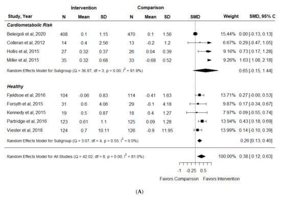 Meta-analyses were conducted and forest plots were created using OpenMetaAnalyst [30] and RStudio [31] software. The methodologist utilized a random-effects model to accommodate the wide range of studies included. Sensitivity analyses were conducted using leave-one-out analysis and by examining effect size according to study quality. Publication bias was described using funnel plots and Egger’s statistics. Heterogeneity was examined using the I2 statistic. Sub-group analyses were conducted to examine efficacy of interventions on outcomes according to whether participants were healthy or had cardiometabolic risk factors.