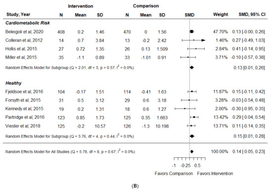 Nine of ten included RCTs reporting fruit and vegetable intake separately could be pooled in a meta-analysis [35,39,42,43,46,51,59,64,77]. In adults who were healthy, there was a small-to-moderate but significant effect of interventions on fruit intake with no heterogeneity [SMD (95% CI): 0.26 (0.13, 0.40) (I2 = 0%)] [42,43,51,64,77], but effect size was more heterogeneous and not significant in participants with cardiometabolic risk factors [0.65 (−0.15, 1.44) (I2 = 91.9%)] [35,39,46,59] (Figure 4A). Participants who were healthy experienced a small but significant increase in vegetable intake [SMD (95% CI): 0.15 (0.01, 0.28) (I2 = 0%)] [42,43,51,64,77], as did participants with cardiometabolic risk factors [0.13 (0.01, 0.26) (I2 = 0%)] [35,39,46,59] (Figure 4B). Neale et al. did not report data that could be included in a meta-analysis, but found no difference in fruit or vegetable intake between the intervention and control groups [60]. Three RCTs reported fruit and vegetable intake combined [68,69,71]. In the pooled analysis, there was no significant increase in fruit and vegetable intake in the intervention compared to control groups [SMD (95% CI): 0.10 (−0.03, 0.23) (I2 = 20.5%)].