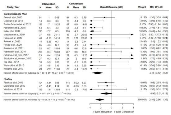 Twenty-one articles representing 18 RCTs reported the effect of interventions on waist circumference [36,38,41,42,44,45,48,53,56,57,62,67,69,70,71,73,76,77,78,79,80]. All studies provided results that could be included in a meta-analysis [36,38,42,44,48,53,56,57,62,67,69,70,71,73,76,77,78,80]. In adults with cardiometabolic risk factors, nutrition and physical activity interventions from nutrition and exercise practitioners reduced waist circumference compared to control conditions across a wide range of interventions [SMD (95% CI): −2.58 cm (−3.62, −1.53) (I2 = 62.7%)] [36,38,44,48,53,56,62,67,69,70,71,73,76,78,80], but results were not significant in studies targeting healthy adults [−0.95 (−2.01, 0.12) (I2 = 0%)] [42,57,77] (Figure 5) (Certainty of Evidence: High).