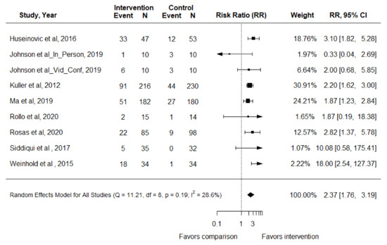 Eight RCTs reported the outcome of achieving 5% weight loss in adults with overweight or obesity [47,50,53,55,67,69,73,78]. In the meta-analysis, adults receiving nutrition and physical activity interventions had a RR (95% CI) of 2.37 (1.76, 3.19) (p < 0.01) of achieving 5% weight loss compared to control groups (I2 = 28.6%) (Figure 6). Seven RCTs represented in nine articles reported the outcome percent weight loss as a continuous variable [33,39,40,50,54,58,59,75,78]. In a pooled analysis of three RCTs, there was no significant effect of interventions on percent weight loss [MD (95% CI): −2.37% (−5.51, 0.77) (I2 = 79.9%)] [50,75,78]. In the remaining four studies, authors did not provide variance to the mean weight loss percentages reported, but all reported increased percent weight loss in participants who received the interventions compared to the controls [39,54,58,59].