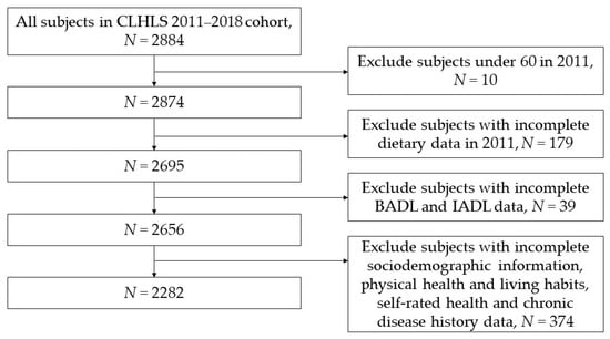 In this study, subjects in CLHLS who were followed in both 2011 and 2018 were included in the cohort. The research content included dietary-related data, basic activities of daily living (BADL), instrumental activities of daily living (IADL), sociodemographic information, physical health and living habits, self-rated health, and some chronic disease history of the subjects in the 2011–2018 cohort [35]. According to the inclusion and exclusion criteria in Figure 1, a total of 2282 subjects were finally included in this study.