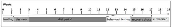 Food intake was weighed daily at the same time and the body weight was documented on the same day each week. The cages were changed once a week while weighing the animals in order to cause as little stress as possible. Seventeen weeks after the start of the diet phase and two weeks after the completion of the behavioral tests, mice were euthanized. The timeline is illustrated in Figure 1.