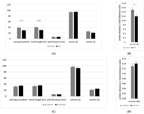 (A) Open-field test with C57BL/6 mice, control = normal weight, DIO = diet-induced obesity, means ± standard error of mean (SEM), ** p ≤ 0.01, *** p ≤ 0.001. (B) Anxiety index (center distance/total distance ratio) of C57BL/6 mice, control = normal weight, DIO = diet-induced obesity, means ± standard error of mean (SEM), * = p ≤ 0.05. (C) Open-field test with C57BL/6 mice. (D) Anxiety index (center distance/total distance ratio) of C57BL/6 mice.