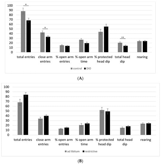 (A) Elevated plus maze test with C57BL/6 mice, control = normal weight, DIO = diet-induced obesity, means ± standard error of mean (SEM), * p ≤ 0.05, ** p ≤ 0.01. (B) Elevated plus maze test with C57BL/6 mice, means ± standard error of mean (SEM).