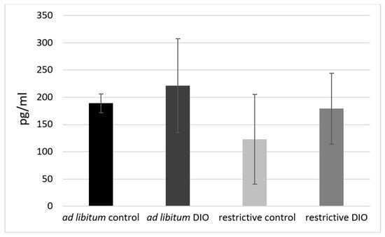 The hormone values of all groups were relatively low as compared to other studies [,]. Although the ad libitum-fed DIO group showed the highest corticosterone level and the restrictive control group showed the lowest corticosterone level, these results were not significant (Figure 6).