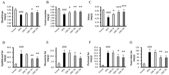After sacrifice, muscle and adipose tissues were collected and weighed. The muscle tissue weights (quadriceps, gastrocnemius, and soleus) were significantly decreased by HFD feeding and were significantly increased by GBE administration, in a dose-dependent manner (Figure 2A–C). The adipose tissue weights (epididymal, mesenteric, and perirenal fat) were significantly increased by HFD intake and were significantly decreased by GBE treatment, in a dose-dependent manner (Figure 2D–G).