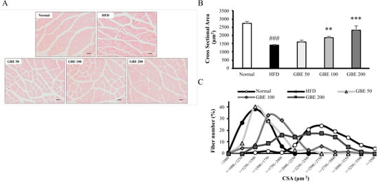 The adipocyte size of epididymal fat and myofiber CSA of gastrocnemius were measured using captured images of H&E-stained sections. The mean adipocyte size was significantly increased in the HFD group compared to the normal group. It was significantly decreased in the GBE 100 and GBE 200 group compared to the HFD group (Figure 3A,B). The adipocyte size distribution graph showed an increase in adipocyte size from HFD feeding and a decrease from GBE treatment (Figure 3C). The average CSA was significantly lower in the HFD group than the normal group. It was significantly increased in the GBE 100 and GBE 200 group compared to the HFD group (Figure 4A,B). The CSA distribution of each myofiber in the HFD group was decreased compared to the normal group. The GBE treatment enlarged it in a dose-dependent manner (Figure 4C).