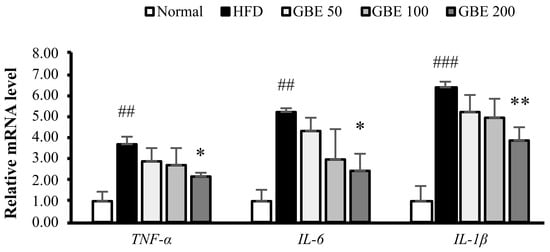 GBE administration down-regulated the expression levels of inflammatory cytokines. The mRNA expression levels were normalized to the gapdh level. Data are expressed as mean ± SD. ## p < 0.01, and ### p < 0.001 versus the normal group. * p < 0.05, ** p < 0.01, versus the HFD group.