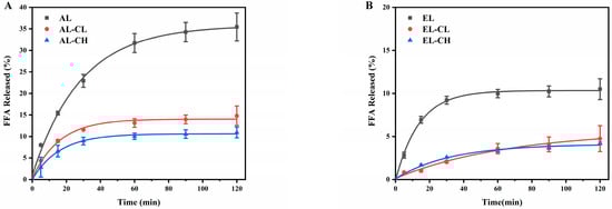 The hydrolysis degree and rate of lipids can be determined by recording the release rate of FFA during in vitro intestinal digestion. Upon entry into the small intestine, dietary triglycerides are emulsified by bile acids and then broken down by pancreatic lipase to produce 2-monoacyglycerol and fatty acids []. As shown in Figure 1, interestingly, the release of FFA during intestinal digestion decreased with the presence of chlorophyll both in the adult and infant digestion systems. In the first 30 min, both AL-CL and AL-CH had a rapid production of FFA to a maximum level, then followed by no obvious increase (Figure 1A). In contrast, the FFA released from AL still increased following digestion time points. The maximum FFA released from AL-CL (14.8 ± 2.2%) and AL-CH (10.9 ± 1.3%) decreased by 58.1% and 69.2%, respectively, compared with AL (35.4 ± 4.5%) (Figure 1A). Likewise, the final release of FFA in EL-CL (4.8 ± 1.5%) and EL-CH (4.2 ± 2.0%) decreased by 54.3% and 60.0%, respectively, versus EL (10.5 ± 2.3%) (Figure 1B). These results indicated that in the presence of chlorophyll, maybe only a small amount of lipase molecules moved from the aqueous phase and attached to the surfaces of oil droplets, further hydrolyzing triacylglycerol molecules []. Recent studies found that when adding 0.75% w/w nanocellulose to a high-fat food, the hydrolysis rate of FFA by triglycerides was reduced by 48.4% in simulated gastrointestinal digestion []. Here, the present work presented for the first time that chlorophyll exhibited a greater impact on the digestion of lipids in vitro, and it could even be a better choice to reduce the release rate of FFA.