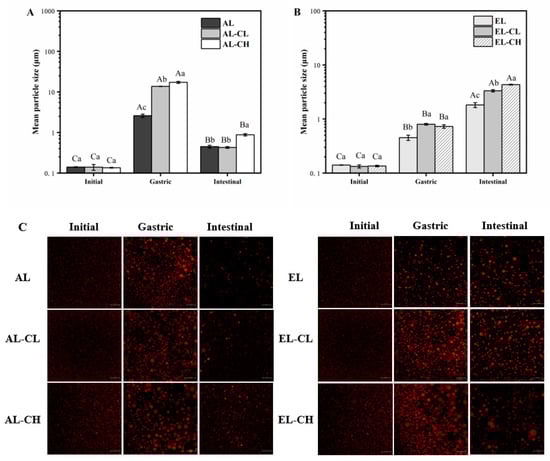 It could be seen that the mean particle sizes of oil droplets in AL-CL and AL-CH were markedly larger than those of AL (p < 0.05), Figure 2A. Consistently, a similar trend was seen in the in vitro infant digestion systems (Figure 2B). In particular, the oil droplet sizes of all samples in adult systems (2.59 to 17.26 μm) were much higher than those in infant systems (0.45 to 0.73 μm). This may be owed to the different activities of pepsin in the stomachs of adult and infant systems, which led to different degrees of protein hydrolysis [].