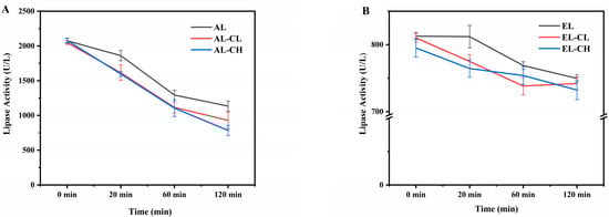 Lipase activity during in vitro (A) adult and (B) infant intestinal digestion. Data were shown as mean ± SD of three replicates.