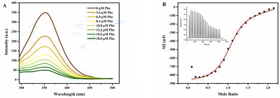 Firstly, fluorescence spectroscopy was conducted to obtain further information on whether pheophytin interacted with pancreatic lipase. The characteristic fluorescence of protein was mainly conditioned by tryptophan residues due to its sensitivity to the microenvironment surrounding the fluorescence residues []. As depicted in Figure 5A, under the excitation of 280 nm, pancreatic lipase showed a strong fluorescence emission band at 353 nm in the absence of pheophytin. With the increase in the pheophytin concentration, the fluorescence intensity of pancreatic lipase decreased gradually at about 353 nm, which could be attributed to the interaction between pheophytin and pancreatic lipase, such as the excited-state reaction, molecular rearrangement, energy transfer, ground-state complex formation, and the collision quenching process []. Meanwhile, in the presence of pheophytin, the wavelength of the maximum fluorescence intensity of lipase gradually blue-shifted from 353 nm to 350 nm, suggesting the hydrophobicity around the protein chromophore group might be strengthened and the tryptophan residues of protein were exposed from the hydrophilic environment to the hydrophobic environment [].