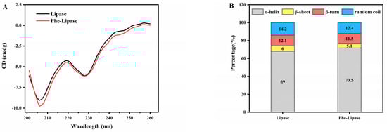 (A) Circular dichroism spectra (CD) and (B) secondary structure fractions of pancreatic lipase within the absence/presence of pheophytin (Phe). Data were shown as mean ± SD of three replicates.