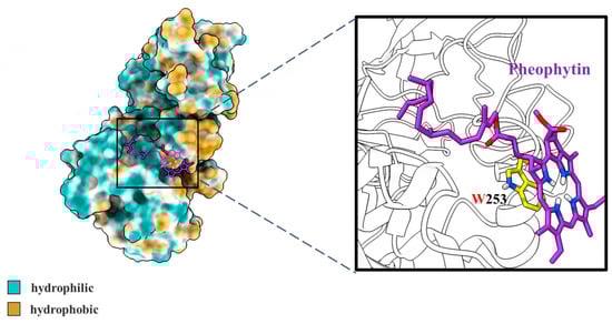 Conformational analysis of molecular docking results for pheophytin and pancreatic lipase. The structure of pheophytin was drawn as sticks, while the structure of lipase was drawn as the surface. The hydrophilic and hydrophobic groups of pancreatic lipase were painted cyan and yellow, respectively. The solid frame area presented a close-up view of the binding site for pancreatic lipase and pheophytin.
