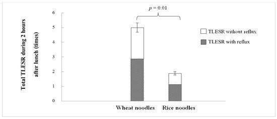 The total number of TLESR (transient lower esophageal sphincter relaxations) and TLESR associated with and without gastroesophageal reflux during 2 h after lunch comparing wheat and rice noodle ingestion.
