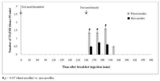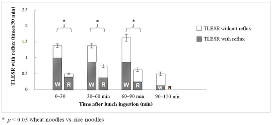 During the 2-h period after lunch, wheat noodle ingestion significantly produced more TLESR events than rice noodle ingestion (5.00 ± 0.68 vs. 1.88 ± 0.30 times/2 h, p = 0.01; Figure 1). The difference was statistically significant during the first 30 min of recording (1.38 ± 0.32 vs. 0.50 ± 0.19 times/30 min, p < 0.05), 30–60 min (1.38 ± 0.32 vs. 0.75 ± 0.16 times/30 min, p < 0.05), and 60–90 min postprandial (1.63 ± 0.38 vs. 0.63 ± 0.18 times/30 min, p < 0.05). The number of TLESRs decreased after 90 min (wheat ingestion 0.50 ± 0.27 times/30 min) with no TLESR detected in all subjects during 90–120 min after rice ingestion (Figure 2). The total number of TLESR associated with reflux after wheat noodle ingestion tended to be higher than rice noodle ingestion, but it did not reach statistical significance (2.88 ± 0.72 vs. 1.13 ± 0.13 times/2 h, p > 0.05; Figure 1). The number of swallows demonstrated by pharyngeal contraction during TLESR monitoring for 2 h after lunch for the rice and wheat meal was similar: 44 (28–83) times and 45 (34–82) times, respectively (p > 0.05). The example of esophageal manometry tracing of a patient was shown in the supplement link (Figure S1).