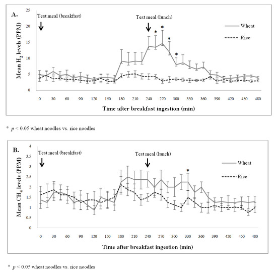 The mean exhaled H2 and CH4 concentrations before and after breakfast were similar between the wheat and rice study arm (p > 0.05). From 15 min after the lunch, the wheat noodles were significantly associated with a higher exhaled H2 concentration than the rice noodles (p < 0.05), and the H2 concentration remained significantly different at 30 min, 45 min, and 60 min after the lunch (p < 0.05). Overall, after wheat ingestion, the exhaled CH4 concentration was higher than the levels after rice ingestion, with a significantly difference found at 90 min after lunch (p < 0.05). The exhaled H2 and CH4 concentration profiles during the study were demonstrated in Figure 3A,B.