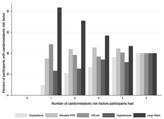 Prevalence of each cardiometabolic risk factor based on number of factors a participant presented.