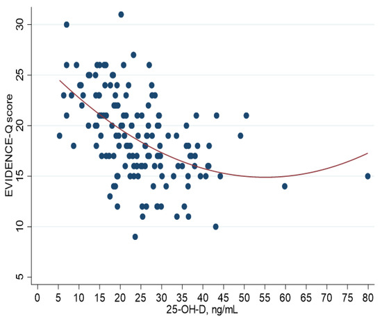 Scatterplot of EVIDENCE-Q score (y-axis) versus serum 25-hydroxyvitamin D (25-OH-D) levels (x-axis) with quadratic fitting.