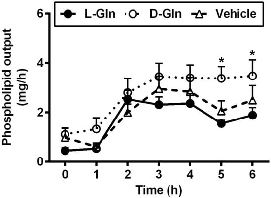 The lymphatic outputs of phospholipids in lymph fistula rats infused intraduodenally with a bolus of 20% Intralipid containing either saline alone (vehicle group), 85 mM L-glutamine (L-Gln group) or 85 mM D-glutamine (D-Gln group), respectively. Data are expressed as mean ± SEM, n = eight per group. * p < 0.05 D-Gln vs. L-Gln. L-Gln, L-glutamine; D-Gln, D-glutamine.