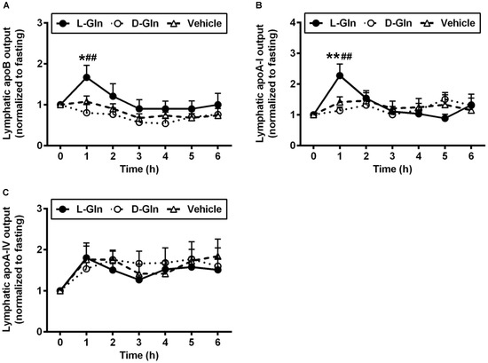 The lymphatic outputs of ApoB (A), ApoA-I (B), and ApoA-IV (C) in lymph fistula rats infused intraduodenally with a bolus of 20% Intralipid containing either saline alone (vehicle group), 85 mM L-glutamine (L-Gln group) or 85 mM D-glutamine (D-Gln group), respectively. Data are expressed as mean ± SEM, n = eight per group. * p < 0.05, ** p < 0.01 L-Gln vs. vehicle; ## p < 0.01 L-Gln vs. D-Gln. ApoB, Apolipoprotein B; ApoA-I, Apolipoprotein A-I; ApoA-IV, Apolipoprotein A-IV; L-Gln, L-glutamine; D-Gln, D-glutamine.