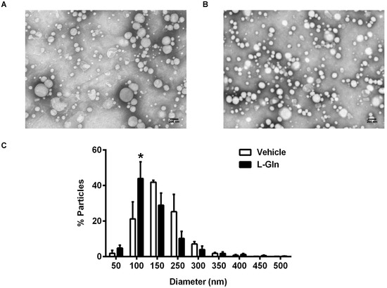 The analysis of lipoproteins from lymph collected 1 h after a bolus infusion of 20% Intralipid containing either saline alone (vehicle group) or 85 mM L-glutamine (L-Gln group), respectively. Representative electron microscopic images of the lipoprotein particles from vehicle controls (A) and L-Gln-treated rat (B). Scale bar: 200 nm. The size of lipoprotein particles was quantified and the distribution of particle sizes was shown (C). Data are expressed as mean ± SEM, n = eight per group. * p < 0.05 L-Gln vs. vehicle. L-Gln, L-glutamine; D-Gln, D-glutamine.
