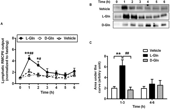 Lymphatic RMCPII output in lymph fistula rats infused intraduodenally with a bolus of 20% Intralipid containing either saline alone (vehicle group), 85 mM L-glutamine (L-Gln group) or 85 mM D-glutamine (D-Gln group), respectively (A–C) representative Western bolt image showing RMCPII in lymph. C: Calculated areas under the curve for the curves depicting lymphatic RMCPII output. Data are expressed as mean ± SEM, n = eight per group. * p < 0.05, ** p < 0.01 L-Gln vs. vehicle; # p < 0.05, ## p < 0.01 L-Gln vs. D-Gln. RMCPII, rat mucosal mast cell protease II; L-Gln, L-glutamine; D-Gln, D-glutamine.