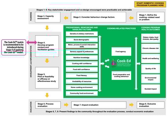 - Asher, R.C.; Jakstas, T.; Wolfson, J.A.; Rose, A.J.; Bucher, T.; Lavelle, F.; Dean, M.; Duncanson, K.; Innes, B.; Burrows, T.; et al. Cook-Ed(TM): A Model for Planning, Implementing and Evaluating Cooking Programs to Improve Diet and Health. Nutrients 2020, 12, 1011. [Google Scholar] [CrossRef]
