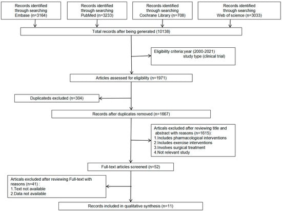 The details of the search are shown in Figure 1. A total of 10,138 potential reports were identified from PubMed, Embase, Cochrane Library, and Web of Science. Based on the year of publication and the type of study, we included 1971 articles. After re-examination, 304 duplicated studies were deleted. After reviewing the titles and abstracts, 1615 nonconforming studies were excluded. After reviewing the full texts, 41 studies that did not meet the requirements were excluded. Finally, eleven studies met the selection criteria [23,24,25,26,27,28,29,30,31,32,33].