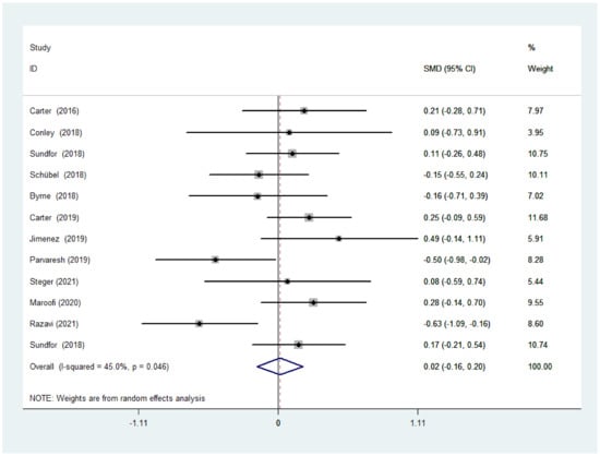 There was no significant difference between IF and CCR for BMI (SMD = 0.02, 95% CI (−0.16, 0.20) p = 0.848; Figure 2). The SMD showed no significant heterogeneity using the random-effect model (I2 = 45.0%, p = 0.046). Publication bias was insignificant (Supplementary Figure S1; Egger’s test: p = 0.730). The funnel plot is shown in Figure 3.