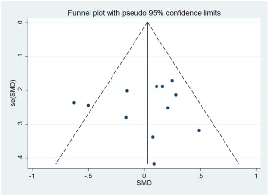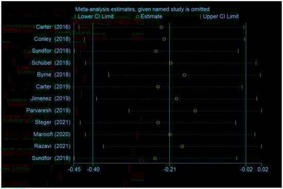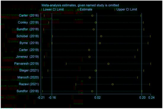 Egger’s test was used to measure publication bias (p = 0.730 for BMI and p = 0.401 for body weight). Meta-analysis of articles included in this study revealed no publication bias (Figure 11 and Figure 12). The stability of our meta-analysis was demonstrated by the sensitivity analysis (Figure 13 and Figure 14).