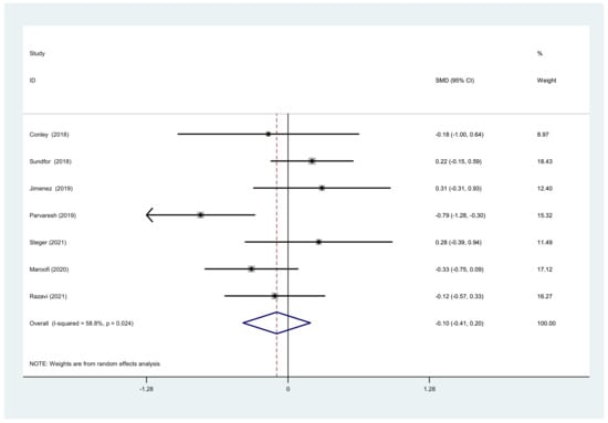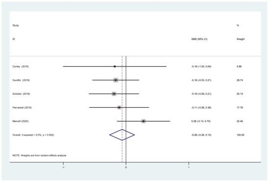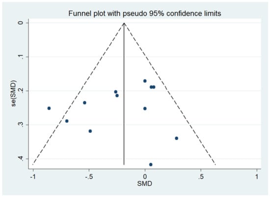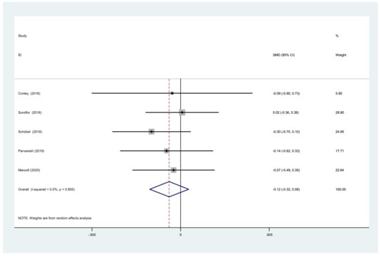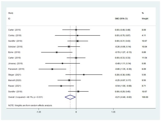There was a significant difference between IF and CCR for weight (SMD = −0.21, 95% CI (−0.40, −0.02) p = 0.028; Figure 4). The SMD showed no significant heterogeneity using a random-effect model (I2 = 48.1%, p = 0.031). Publication bias was insignificant (Supplementary Figure S1; Egger’s test: p = 0.401). The funnel plot is shown in Figure 5.