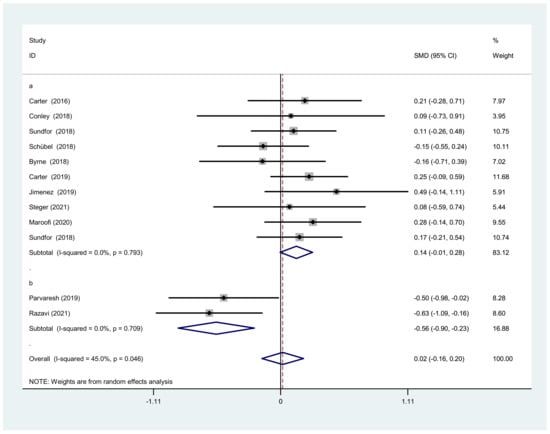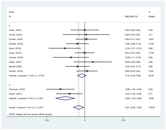 Figure 9. Forest plot of BMI changes after IF and CCR interventions based on fasting days. (a) Normal intermittent fasting (calorie restriction is usually two days per week). (b) Modified alternate-day fasting (a very lowcalorie diet (75% energy restriction) during the three fast days).