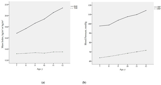 BMI has been used to screen for obesity. However, evidence indicates that BMI did not take into account changes in body proportions and body fat levels during adolescent growth, raising questions about the accuracy of BMI in assessing obesity in adolescents [38]. In 2017, Peterson et al. raised TMI, a super body fat index, as an alteration of BMI to assess obesity in children and adolescents for the first time. In children and adolescents, TMI was more stable over time, estimated body fat percent more accurately, and presented a lower misclassification in screening for obesity [13]. A study conducted in Finland also confirmed the high stability of TMI with age among children [39]. Consistent with the above research [13,39], our study investigated the changes of TMI and BMI in Chinese children from 7 to 12 years old and found that TMI was approximately constant at 13 kg/m3, while BMI increased significantly. In addition, the present study confirmed previous findings [40,41,42] that SBP and DBP increased with age in elementary school children, and the stability of SBP was higher than DBP from childhood to adulthood.